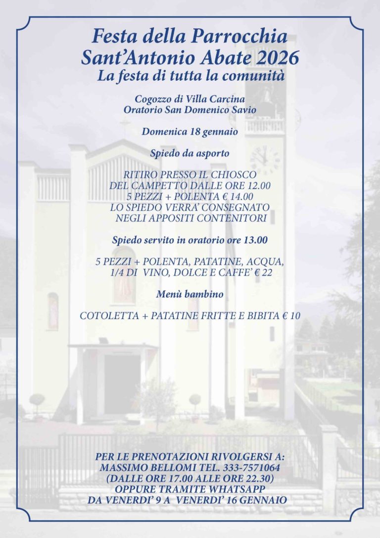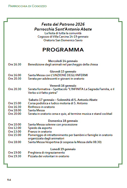 Da mercoledì 14 gennaio a Lunedì 19 gennaio avrà luogo la consueta FESTA PATRONALE di S.Antonio Abate nella parrocchia di Cogozzo.
