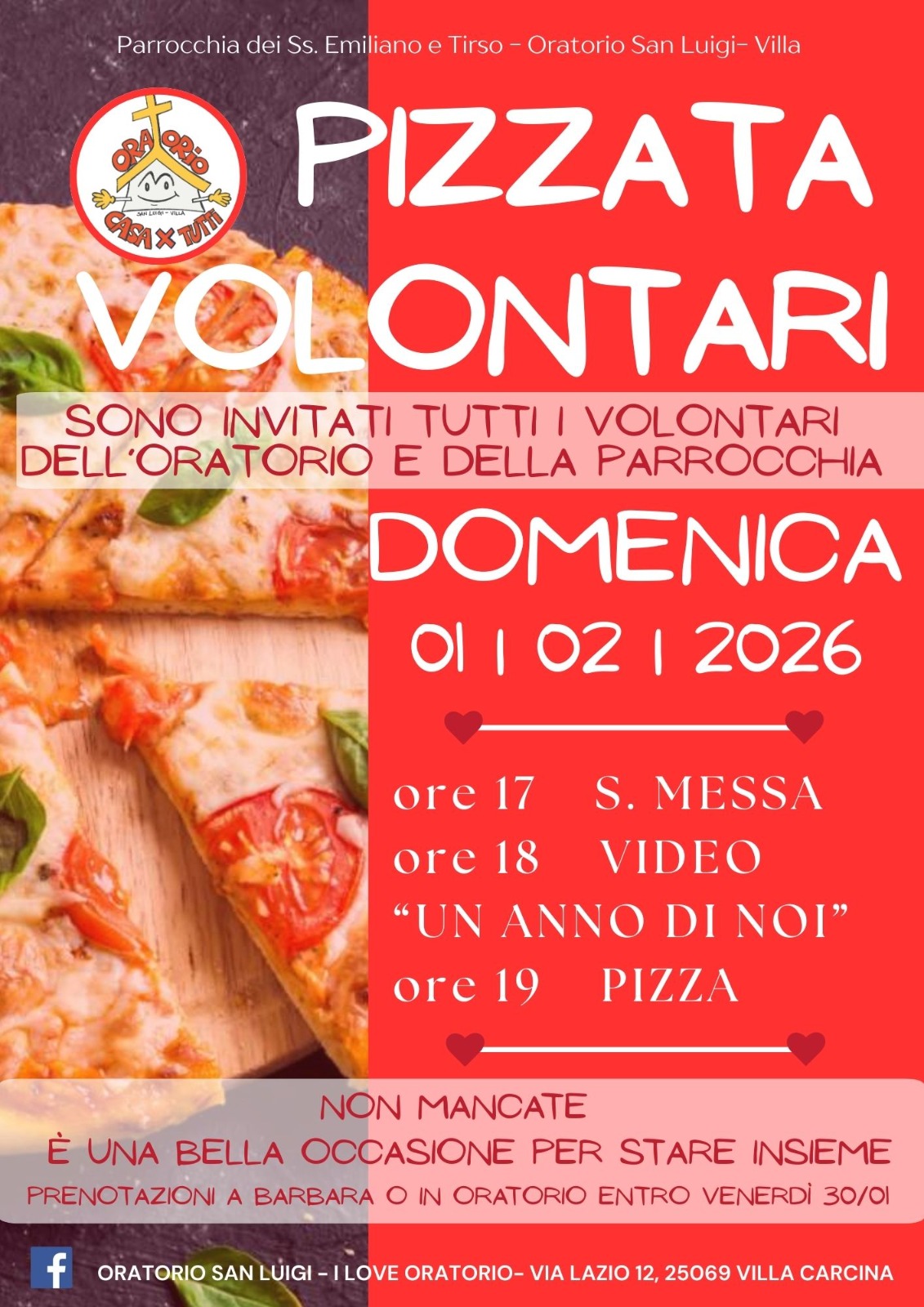 DOMENICA 1 FEBBRAIO .. ci ritroviamo come VOLONTARI della Parrocchia e dell’Oratorio per una serata semplice ma IMPORTANTE! Un modo per riconoscersi come parte di qualcosa di grande… dove ognuno di noi porta un piccolo pezzo di sè! Qualsiasi sia il tuo servizio, che sia in sacrestia o al bar, che sia a contatto con i ragazzi o ai fornelli o con un attrezzo in mano.. È IMPORTATE e COSTRUISCE IL NOSTRO ESSERE COMUNITÀ!
