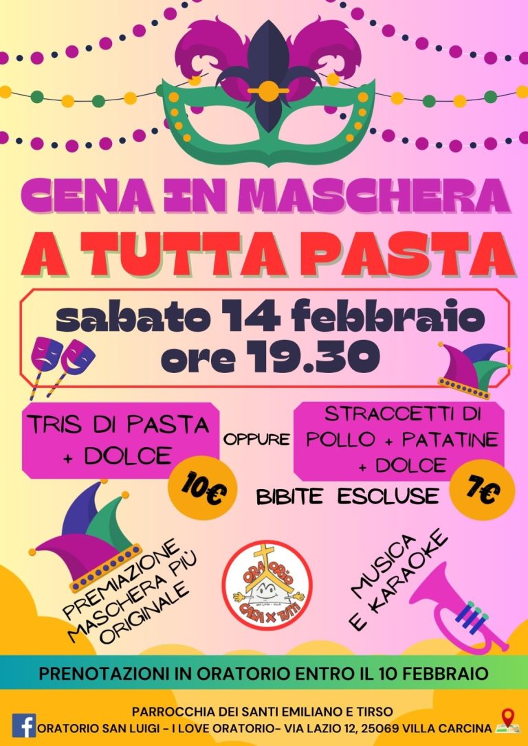 Sabato 14 febbraio grande cena in oratorio a base di pasta con premiazione della maschera più originale.